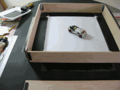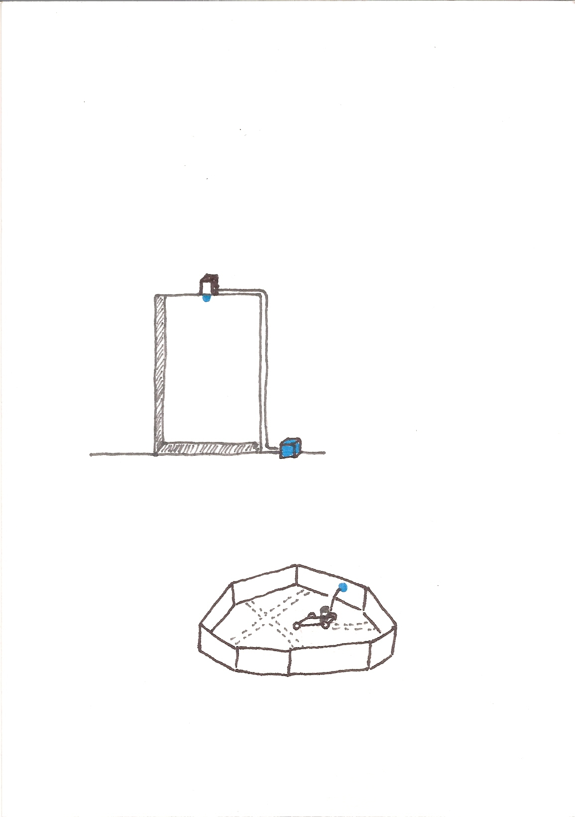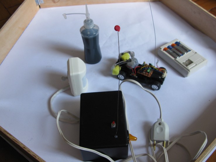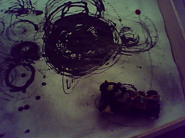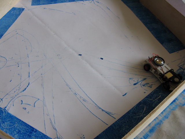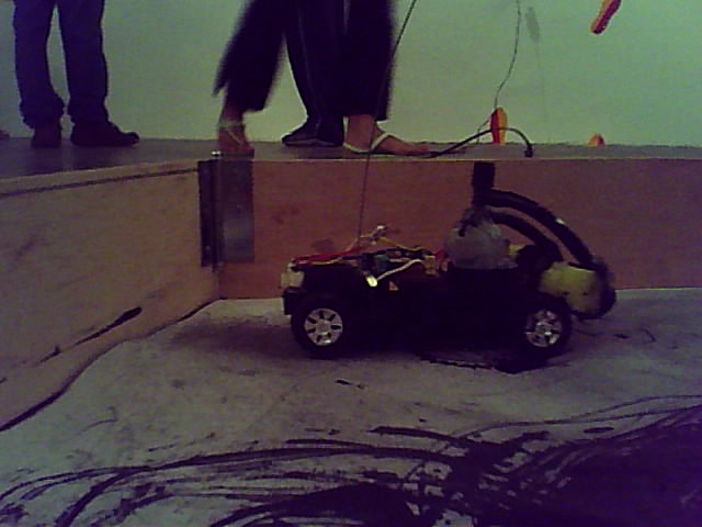 Um carrinho de brinquedo movido à pilha, é acionado por um sensor de presença fixado na entrada do recinto onde o trabalho é exposto. Sua circulação é limitada por uma área cercada por pequenas chapas de compensado. Contendo um reservatório de tinta agregado à sua carcaça, o carrinho marca de forma aleatória o papel que serve como película base para sua atuação.