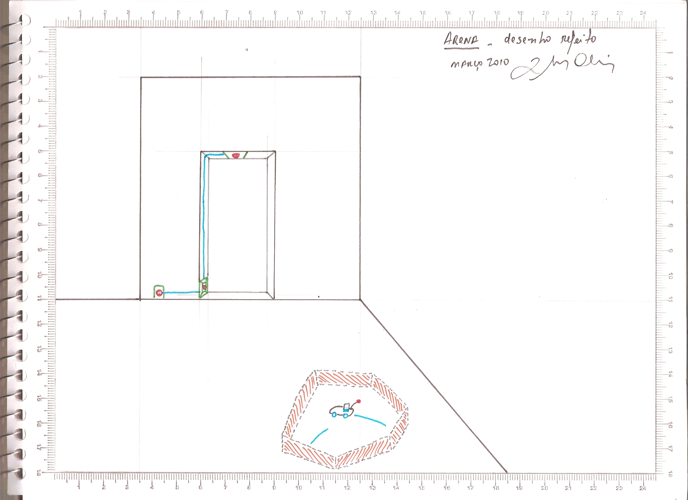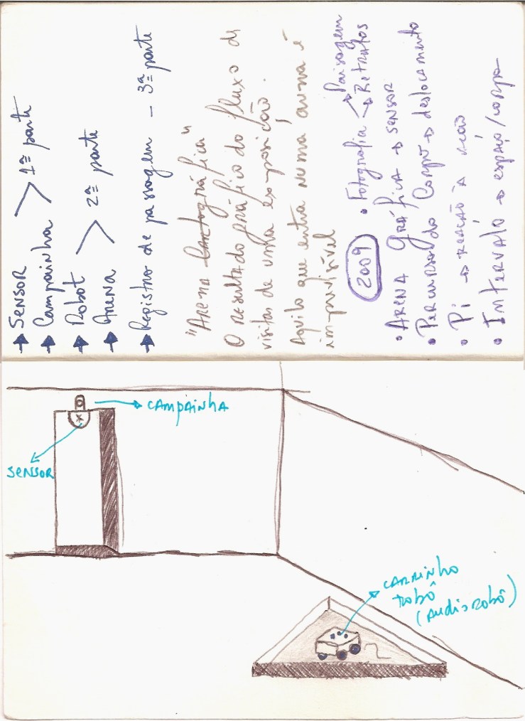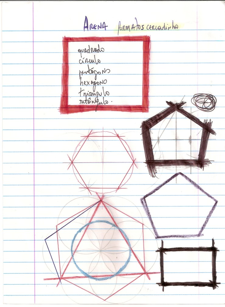 Este desenho faz parte de um conjunto de materiais que fiz, para e durante a exposição “Sem Título#1 – Experiências de Pós-Morte” na Galeria Oscar Cruz, curadoria de Bernardo Mosqueira. Essa foi a segunda montagem de Arena, dentro do programa que faço para a montagem de cada trabalho. No meu entendimento esse trabalho ainda necessita de mais uma montagem, grande, bem grande.
