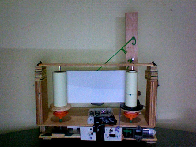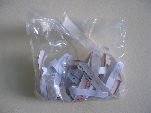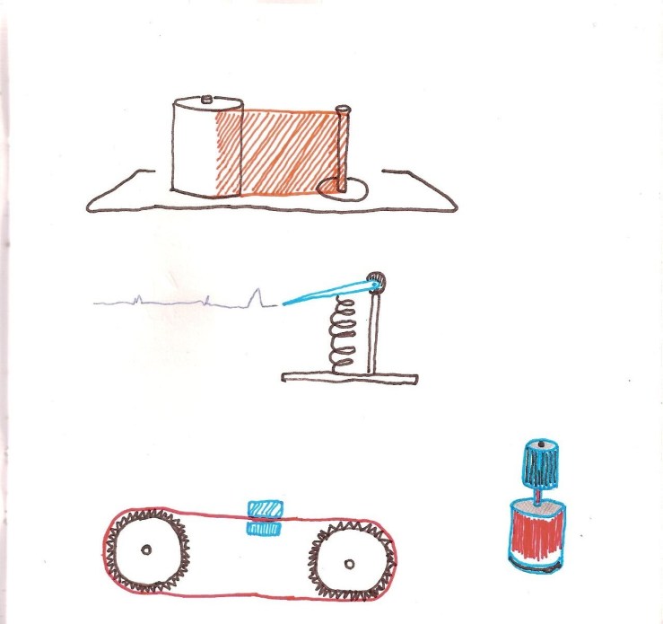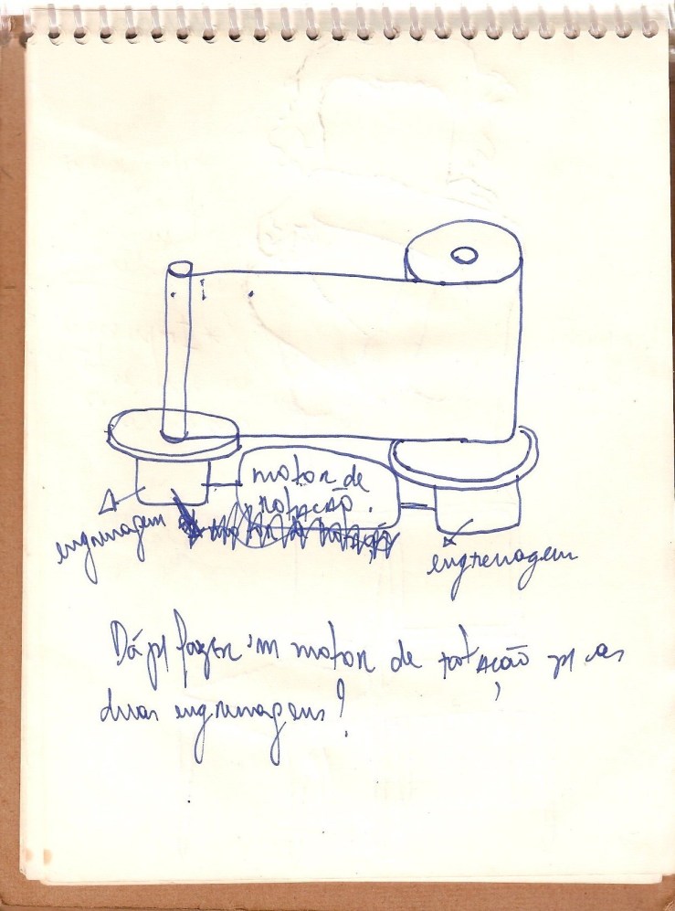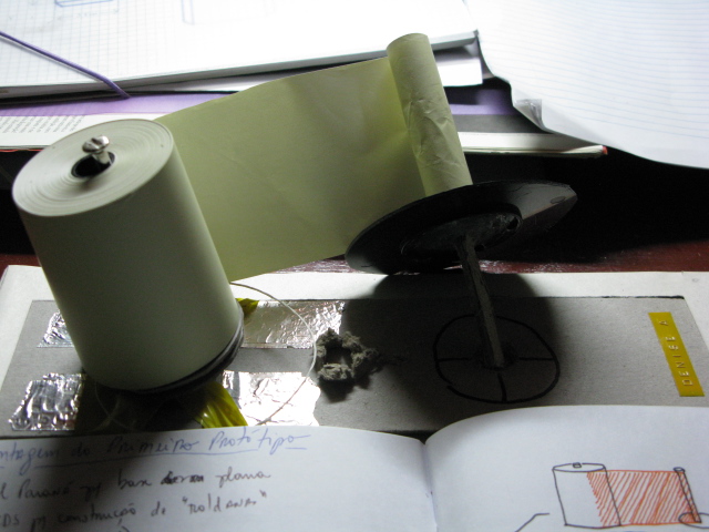 “Percurso” é um trabalho que utiliza uma máquina construída e usada pela artista para registrar as vibrações e movimento do seu corpo enquanto se desloca pela cidade. Derivada da idéia de um sismógrafo, a máquina possui uma agulha que marca sobre o papel uma linha dentada contínua durante a locomoção e a mesma linha se estabiliza nas pausas entre um lugar e outro percorrido. Presa ao corpo, a máquina estabelece uma conexão funcional com quem a carrega pelo resultado gráfico que deixa na bobina, como se fosse um orgão agregado auxiliar na percepção de uma atividade fugáz. O trabalho acontece durante as caminhadas aleatórias pela cidade/campo ou outro destino. O resultado fica exposto na bobina, o papel utilizado é termoquímico e qualquer informação inserida nele tem uma “vida” de até 2 anos, isso reflete o estado do corpo, hoje me movimento assim daqui dois anos de outro jeito e assim por diante.