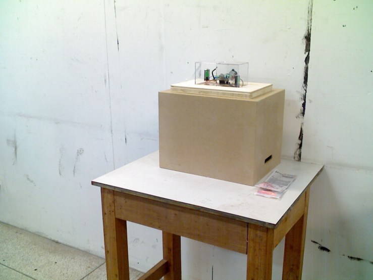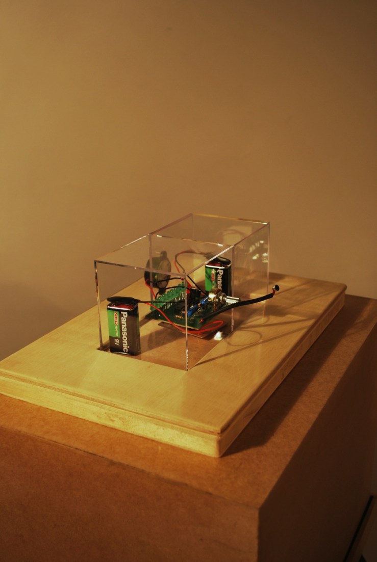 A instalação consiste na disposição de um objeto eletrônico, que passa o tempo de sua estada na área escolhida captando o som e medindo a altura/volume acústico. Com o aumento gradual ou s;ubito do som ambiente, ao ultrapassar a medida de 80 decibéis, o objeto emite um ruído estridente e após voltar/estabilizar o volume original do local o ruído é interrompido.