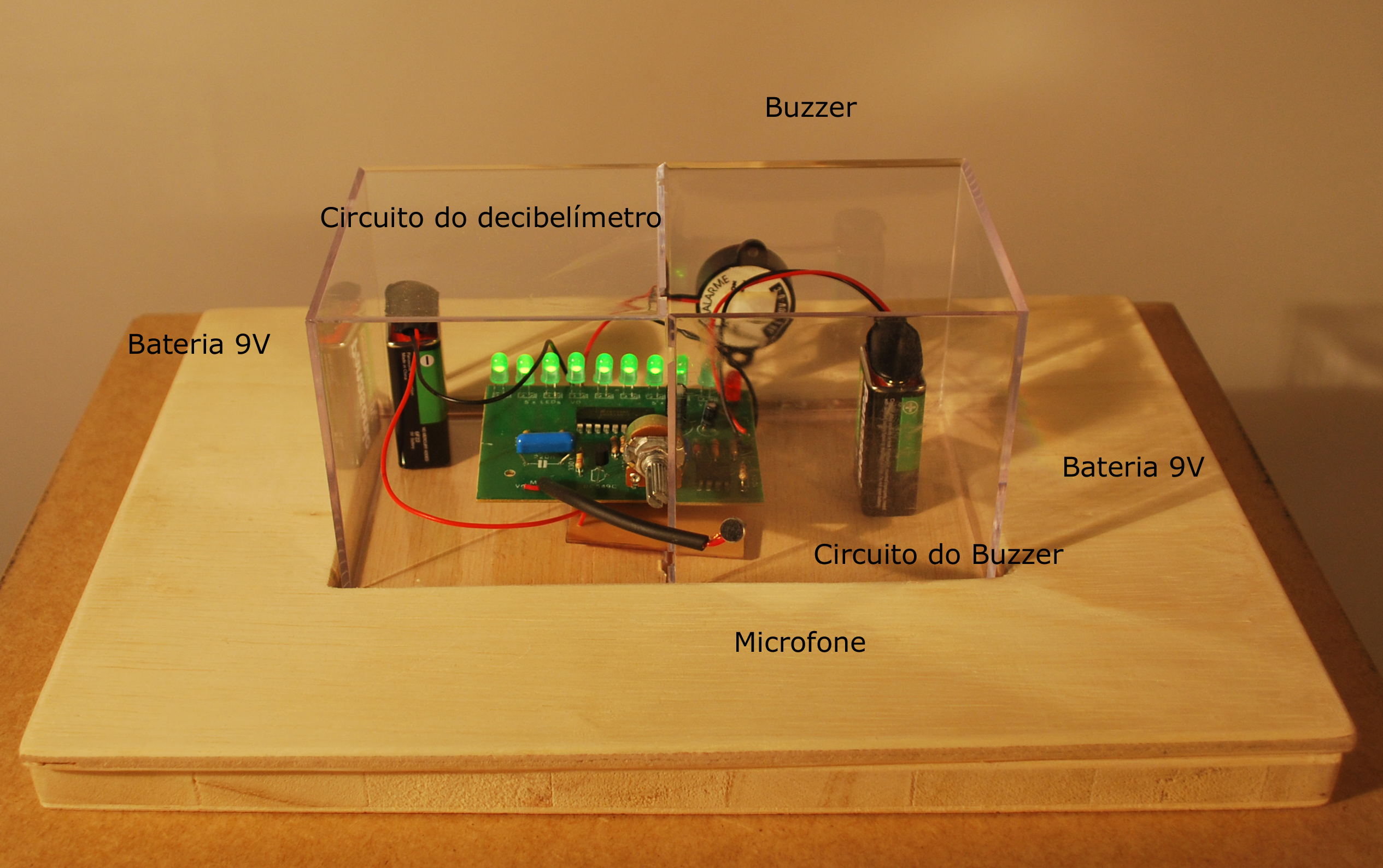 Materiais: compensado tipo Virolinha, circuito eletrônico, plástico e baterias 9V.